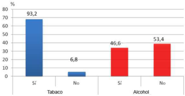 Al relacionar los posibles factores de riesgo asociados al cáncer bucal, se observó un predominio de pacientes que consumían tabaco (93,2 %; n= 68), pero no se especifica la forma del consumo (convencional, tabaquismo invertido). El 46,6 % consumían alcohol (n= 34), no se especifica datos como tipo de alcohol, frecuencia de consumo y cronicidad del hábito (Fig. 3).