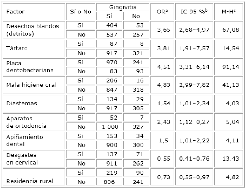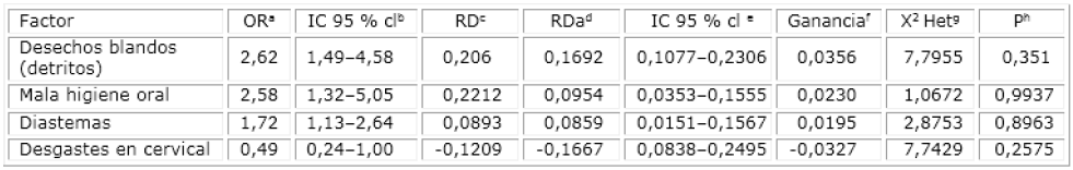 Al igual que otros estudios la placa dentobacteriana15,16 y mala higiene bucal5,15,17 resultaron con significancia estadística en el análisis bivariado; sin embargo, se decidió no incluir placa en el análisis multivariado pues se considera que no tiene efecto independiente sobre la gingivitis, ya que la placa dentobacteriana es consecuencia de la mala higiene. Los desechos blandos (índice de detritos, componente del IHO-S) se consideraron para el análisis multivariado pues podrían tener efecto independiente, por no relacionarse siempre con la mala higiene bucal, sino con el cúmulo de material blando sobre los dientes; sobre todo, si se hubiera ingerido alimentos, sin que forzosamente fuera solo placa. Esto se debe a que a que las revisiones no siempre se realizaron a la misma hora, y algunos pudieron haber tomado algún alimento. Esta variable resultó tener la mayor fuerza de asociación y ganancia en el estudio, es decir que evitando el acúmulo de detritos se pueden evitar casos de gingivitis con una intervención adecuada, como podría ser la promoción del cepillado posterior a la ingesta de alimentos.