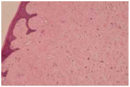 The patient had poor oral hygiene and was not taking any medication. There were no systemic diseases and her medical history was noncontributory. The lesion was first noticed by the patient 3 years earlier and it had slowly grown to its present size. Neither radiopacities within the lesion nor radiolucency of the underlying bone were observed from the periapical radiographic evaluation. The differential diagnosis included peripheral ossifying fibroma, peripheral giant cell granuloma, and GCF. Routine blood tests were found normal. Complete surgical excision of the lesion was performed using a number 11 scalpel blade under local anesthesia and strict aseptic protocol and the specimen was submitted for histopathologic analysis. Calculus was not associated to neighbor teeth so that treatment of their surface was not necessary. Tissue examination under optical microscopy revealed a lesion composed of mature and compact fibrous connective tissue with numerous large spindle- and stellate-shaped mononuclear cells, and some multinucleated cells covered by a stratified squamous epithelium with thin, papillary projections (Fig. 2). The stellate-shaped giant cells had hyperchromatic nuclei, while the cytoplasm was well-demarcated and the cells frequently had a dendritic-like process (Fig. 3). Areas of inflammation were rarely noted. The diagnosis of GCF was made. No complications or recurrence of the lesion have been noted after 4 years of follow-up.