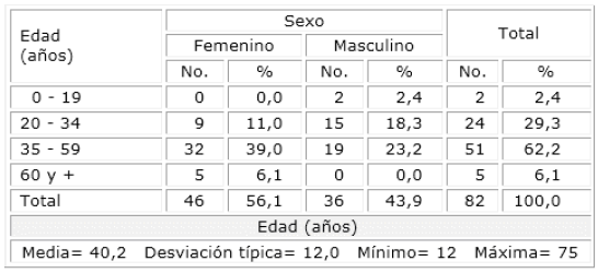 En la tabla 1 se refleja el mayor número de personas con tratamiento endodóntico incluidas en el grupo de 35 a 59 años: 51 pacientes (62,2 % de la muestra). Al sexo femenino pertenecía el 56,1 %, y 43,9 % por al sexo masculino.