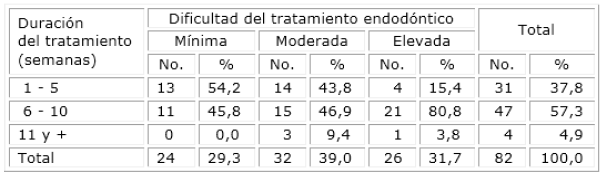 En la tabla 2 se expresa la duración del tratamiento endodóntico en semanas en relación a los criterios de dificultad asignada, registrándose que en el 54% de los pacientes estimados con mínima dificultad para el tratamiento la endodoncia tuvo una duración entre 1 a 5 semanas. En el caso de los pacientes incluidos en el grupo de dificultad moderada el 46,9% finalizaron la terapia entre 6 a 10 semanas mientras que esta misma duración se mostró en el 80,8% de los pacientes contenidos en la categoría de elevada dificultad.