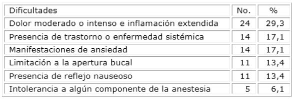 Otras variables estuvieron en correspondencia con la dificultad de tratamiento relacionada con el paciente: antecedentes patológicos, antecedentes anestésicos, conducta del paciente (cooperativo o no), presencia de reflejo nauseoso y complicaciones (mínimas, moderadas o severas) según presencia de dolor e inflamación.