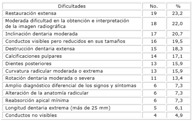 Las dificultades del tratamiento endodóntico relacionadas con el diagnóstico y el tratamiento se exponen en la tabla 4. Se registraron las restauraciones extensas, la moderada dificultad en la obtención e interpretación de la imagen radiográfica, la inclinación dentaria moderada, los conductos visibles, pero reducidos en sus tamaños y la destrucción dentaria extensa en 23,2%, 22,0%, 20,7%, 19,5% y el 18,3 % de la población estudiada, respectivamente.