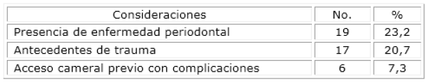 Dentro de las consideraciones adicionales en la evaluación de las dificultades del tratamiento endodóntico la presente investigación mostró un predominio de la enfermedad periodontal y los antecedentes de trauma.
