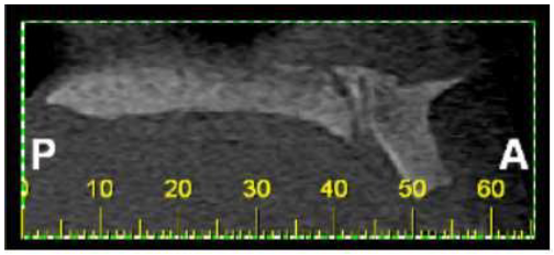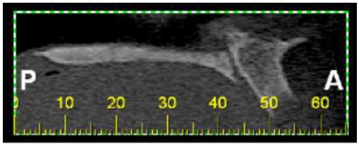 A wider canal (1.9 mm in diameter) could be observed in front of the other two canals, which was slightly displaced to the right in such a way that the two canals could be seen in sagittal sections obtained from the right to the left, one in front of the other in a first section (Fig. 2), with the posterior canal measuring 0.8 mm in diameter. A sequential sagittal section slightly to the left (Fig. 3) revealed the third canal, which measured 0.9 mm in diameter.