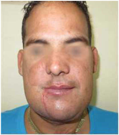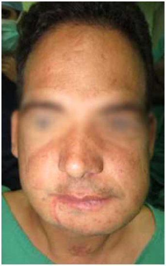 En el posoperatorio inmediato el paciente solo refirió dolor en la zona donante del injerto de mediana cuantía, que fue controlado con analgésicos. Se realizó seguimiento en consulta externa después del alta hospitalaria. No presentó otras complicaciones y refirió estar muy conforme con su aspecto facial (Fig. 3) y con la mejoría funcional alcanzada.