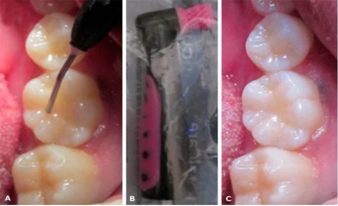 En el procedimiento empleado, se realizó limpieza y pulido de la superficie a tratar para eliminar grasas y placa dentobacteriana remanente, se aisló relativamente con rollos de algodón y se practicó el grabado del esmalte afectado y circundante con ácido fosfórico al 37 % durante 40 s (Fig. 1, B). Se realizó enjuague con aire y agua el mismo tiempo que estuvo expuesto el esmalte al ácido grabador. Se procedió al aislamiento nuevamente y se secó toda la zona de trabajo.