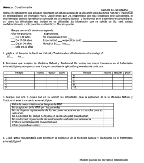 La información se recogió en un cuestionario autoadministrado elaborado al efecto (anexo), de preguntas cerradas y abiertas; instrumento que fue validado por el criterio de expertos, los cuales fueron dos máster en Medicina Bioenergética y Natural, un psicólogo, un especialista en Estomatología General Integral (EGI) y un Estomatólogo General Básico (EGB). Se realizó pilotaje con 15 estomatólogos de otras instituciones de salud no incluidas en el estudio, para determinar el grado de pertinencia, comprensión y dificultad de las preguntas contenidas en el cuestionario, lo que permitió hacer las correcciones necesarias. Las variables seleccionadas para el estudio fueron: