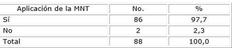 Estos aspectos analizados pueden haber incidido en el elevado porcentaje de aplicación de la MNT referido por los encuestados, resultado que coincide con otros estudios.4,9,10,11