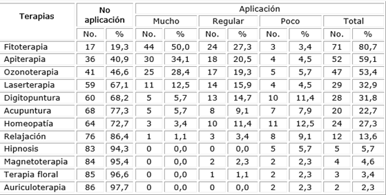 Un elevado porcentaje de los encuestados (80,7 %), señaló como la terapia más utilizada la Fitoterapia (tabla 2), seguida de la Apiterapia (59,1 %) y la Ozonoterapia (53,4 %); terapias en las cuales se advirtió además, que sus mayores porcentajes de aplicación fueron referidos en la categoría de Mucho (50,0 % para Fitoterapia, 34,1 % para Apiterapia y 28,4 % para Ozonoterapia). El resto de los procederes se mostraron muy por debajo de estas cifras, con 67,1 % y más de No Aplicación.