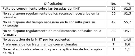 En latabla 3 se observa que las dificultades que resultaron señaladas por más del 50,0 % de los encuestados fueron, la falta de conocimiento sobre terapias de MNT, no disponer regularmente de los recursos necesarios en la consulta (62,5 % en ambos casos) y no disponer del tiempo necesario en la consulta para su aplicación (55,7 %).