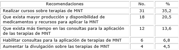 Las recomendaciones de los encuestados se vincularon principalmente a 5 aspectos (tabla 4); el más señalado fue realizar cursos sobre terapias de MNT (35,2 %), seguido en un porcentaje menor (20,5 %), de que exista mayor producción y disponibilidad de medicamentos y recursos para aplicarlas.