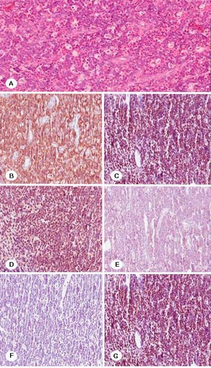 An immunohistochemical panel of CD3, CD20, Ki67, TdT, Bcl2, and Bcl6 antibodies was positive for CD20 and Bcl6 and negative for CD3, Bcl2, and TdT antibodies. The Ki-67 expression rate was 80 %. The histopathological and immunohistochemical exams and immunophenotyping findings led to the diagnosis of immunodeficiency- associated BL (Fig. 2, B-G).