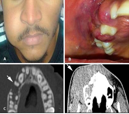 At Professor Edgar Santos Hospital, ceftriaxone and clindamycin were introduced. A physical exam showed painless volume increase of the middle third of the right side of the face (Fig. 1, A) corresponding to a tumor in the superior right gingival mucosa that was erythematous, purplish in color, and of a soft consistency upon palpation, measured approximately 6.7 × 5.7 × 4.4 cm, and was associated with mobility of the teeth of the right jaw (Fig. 1, B). Tomographic slices performed before treatment show images to bone tissue (Fig. 1, C) and soft tissue (Fig. 1, D).