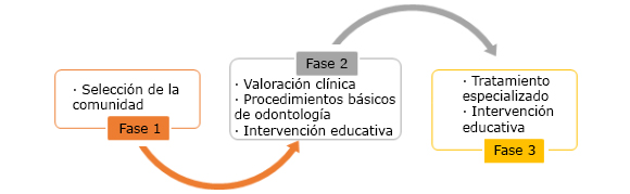El programa contempló la intervención en salud bucal realizado entre 2016 y 2017 a 1.252 niños entre los 4 y 13 años, de estratos socioeconómicos 1 y 2. Se desarrolló a través de tres fases que se presentan en la figura .