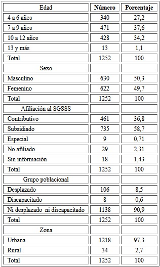 Se realizó con información de historias clínicas. Participaron 1252 de estrato socioeconómico 1 y 2 que identifica las personas que viven con menor capacidad económica de acuerdo con las características de la vivienda y del entorno. Estas fueron valoradas por los odontólogos de la institución ejecutora. El 50,3 % correspondió al sexo masculino, la edad promedio fue 8,2 años. El 58,7 % pertenecía al régimen subsidiado de salud, el 8,8 % de los niños presentaba alguna discapacidad y el 97,3 % residía en la zona urbana (Tabla 1).