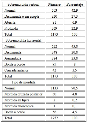 El 51,4 % dentición intertransicional, 12,7 % dentición mixta tardía, 11,3 % dentición permanente y 8,8 % dentición primaria. El 37,5 % relación molar plano terminal recto derecho y 53,1 % plano terminal recto izquierdo. La relación molar que se presentó con mayor frecuencia fue Clase II bilateral. La relación canina derecha e izquierda en los tres grupos fue Clase II. El 76,2 % presentó alteraciones en la sobremordida vertical. El 86,5 % con apiñamiento.