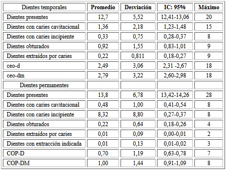 El ceo-d fue de 2,49 (IC: 95%: 2,31-2,67) y ceo-dm fue 2,79 (IC: 95%: 2,60-2,98). A nivel de dientes permanentes se encontró que el COP-D alcanzó el valor de 0,70 (IC: 95%: 0,63-0,78) y el COP-DM de 1,0. (IC: 95%: 0,91-1,09) (Tabla 3).