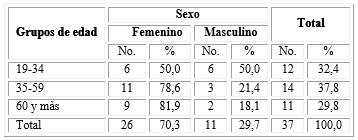 En la tabla 1 se observa que el sexo predominante fue el femenino con 70,3 % y el grupo de edad más representado fue el de 35 a 59 años con 37,8 %.