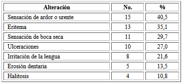En la tabla 2 se muestra que la alteración bucal más referida fue la sensación de ardor o urente con 40,5 %, seguida por el eritema y la sensación de boca seca con 35, 1% y 29,7 %, respectivamente.