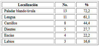 En la tabla 3 se aprecia que el paladar blando/úvula fue la localización más frecuente, presente en 72,2 % de los pacientes, seguido de lengua en 61,1 % y carrillos en 44,4 %.