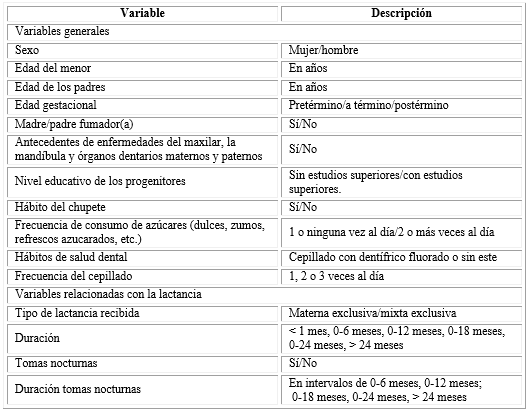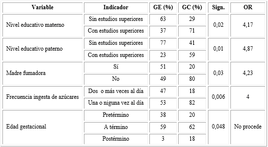 Results: No statistically significant relationship was found between the variables analyzed and breastfeeding. A relationship could be established between the emergence of dental caries and the educational level of the mother (OR= 4.17) and the father (OR= 4.87), daily sugar intake (OR= 4), smoking mother (OR= 4.23) and gestational age (a greater incidence in preterm deliveries).