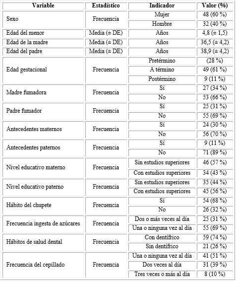 La edad media de las madres fue de 36,5 (± 4,2) años; la de los padres, 38,9 (± 4,2). El 53 % de las madres y el 55 % de los padres afirmaron ser no fumadores. Tampoco informaron antecedentes de enfermedades bucales el 70 % de las madres y el 89 % de los padres. Respecto al nivel educativo, el 34 % de las madres y el 45 % de padres manifestó tener estudios superiores.
