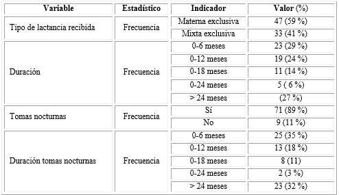 En cuanto a las variables vinculadas directamente con la lactancia, la distribución del total de la muestra queda descrita en la tabla 2.