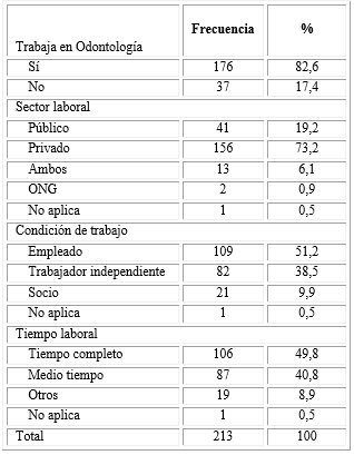Con respecto al estado laboral se obtuvo que el 82,6 % de los participantes ejercía la Odontología en el momento de la encuesta. De los encuestados que ejercían, el 49,8 % se dedicaba a tiempo completo. Asimismo se observó un mayor desarrollo de la práctica profesional en el sector privado (73,2 %) que en el público (19,2 %). Por otra parte, la condición laboral de mayor frecuencia en los egresados fue como empleado con 51,2 % (Tabla 1).
