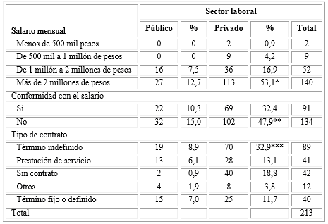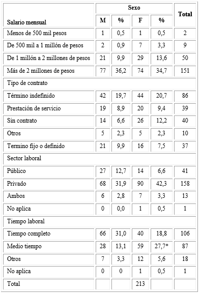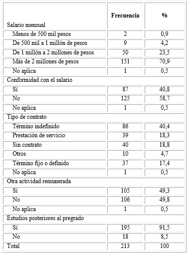 Results: Of the total sample, 82.6% were performing tasks related to their university studies. Of these, 68.5% had a job in the Caribe region and 73.2% in the private sector. The average monthly income of 70.9% of the participants was above 2 000 000 pesos. As to contractual conditions, 49.8% were hired full time and 40.4% had an indefinite term contract.