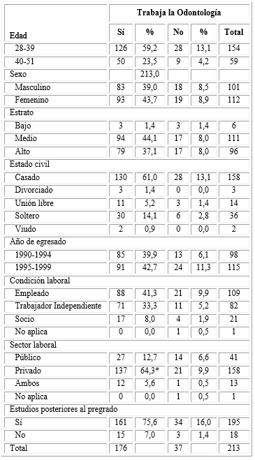 Methods: An observational retrospective longitudinal descriptive study was conducted. The study population was 517 dental professionals graduating in the period 1990-1999, from whom a sample of 213 was obtained. Among the variables analyzed were the distribution of graduates according to their sociodemographic characteristics, employment situation, economic situation and the relationship between employment situation and sociodemographic characteristics.