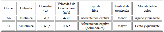 Tabla 1 - Características de las fibras vinculadas a la nocicepción