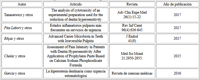 Métodos: Se realizó una revisión bibliográfica sobre las variables en relación con el dolor y su asociación con un estado inflamatorio pulpar. Se analizaron 24 artículos científicos en relación con el dolor pulpar, se escogieron 15 por ser los más afines al propósito perseguido, y todos corresponden a los últimos 5 años, publicados en revistas internacionales y nacionales. PubMed se utilizó como fuente fundamental de búsqueda; otras bases de datos también consultadas fueron Lilacs, Hinari y Medline.