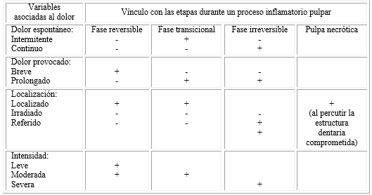 Las variables mencionadas asociadas a los estímulos nociceptivos tienen un importante valor descriptivo que llevadas a la semiología clínica sirven para estudiar el curso de un proceso inflamatorio pulpar.