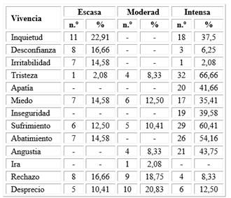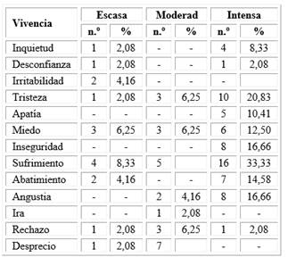 En la tabla 1 se resume la experiencia emocional de los pacientes antes de recibir el tratamiento protésico bucomaxilofacial. Resultó que los pacientes presentaron más de una emoción, las más significativa fueron la tristeza (66,66 %), el sufrimiento (60,41 %), el abatimiento (54,16 %), la angustia (43,75 %) y la apatía (41,66 %) con un alto nivel de intensidad vivencial.