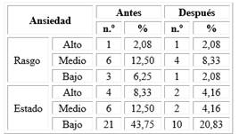 Al evaluar el nivel de ansiedad, se recogió que el 100 % de los pacientes mostraron esta emoción como rasgo o como estado, con mayor presencia el bajo estado de ansiedad (43,75 %). Luego de la rehabilitación de los pacientes la ansiedad disminuyó en la mayoría de los casos, solo el 20,83 % mostraba bajo estado de ansiedad. El resto de los pacientes no mostraron un nivel de ansiedad como emoción (58,33 %); así lo muestra la tabla 3.