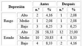 En la tabla 4 se describe que el nivel de depresión de los pacientes fue alto como estado en el 58,33 % de los casos antes del tratamiento, luego de que los pacientes recibieran atención rehabilitadora con prótesis bucomaxilofacial, el nivel de depresión como estado fue alto solo en el 25,00 %, lo que revela una disminución de esta emoción en los pacientes después del tratamiento (52,08 %).