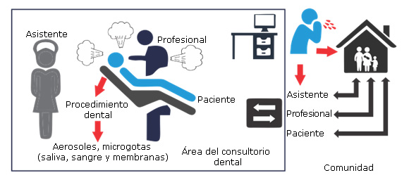 La práctica estomatológica de rutina es de alta exposición contagiosa (para profesional y para paciente) por la generación de aerosoles y microgotas que formarían una cadena de contagio (Fig. 1).12