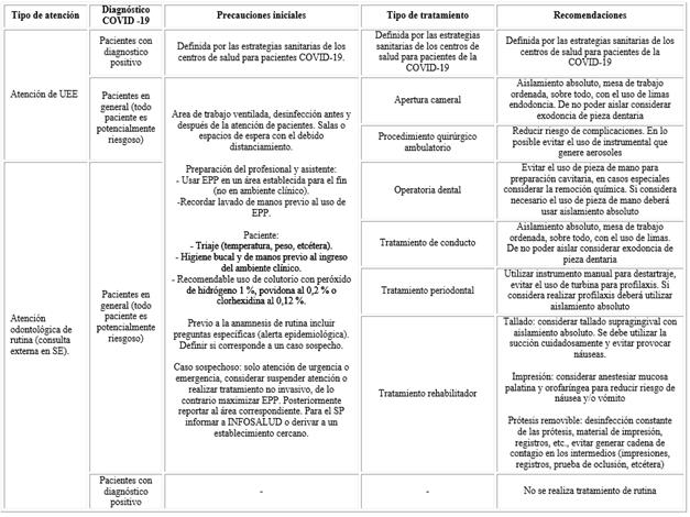 Cabe resaltar que el Ministerio de Salud peruano (MINSA) a la fecha, no ha establecido guías técnicas o normas que podrían favorecer la atención de las UEE y el rol del estomatólogo. Se insta a las instituciones afines (facultades de estomatología, colegio profesional, institutos de investigación, sindicatos, etc.) al pronunciamiento técnico en esta coyuntura mundial.