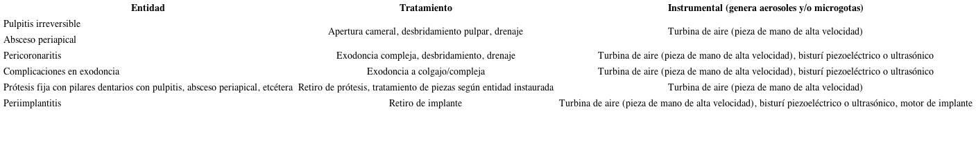 A pesar que la atención estomatológica (perteneciente a consulta externa) está suspendida por la emergencia sanitaria (en el Perú) desde el 16 de marzo y solo se limita a la atención de urgencia y emergencia, es importante considerar que la atención de urgencia y emergencia estomatológica (UEE), en muchos casos, requiere el uso de la turbina de alta velocidad (instrumento rotatorio) (Tabla 1). (14