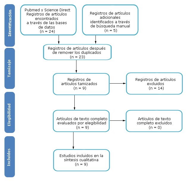 Las referencias bibliográficas de los artículos consultados también se consideraron como búsqueda manual, es decir, artículos pertinentes incluidos en otras fuentes si contaban con los criterios de elegibilidad de la búsqueda. Tras obtener los registros de ambos buscadores, se procedió a verificar si existían duplicados para su eliminación, posteriormente se realizó el tamizaje por título y resumen, para poder ejecutar la evaluación de los textos completos. La extracción de datos, el manejo y análisis de datos consistió en la descripción de la evidencia relevante la cual se presenta en diagrama de flujo de acuerdo a los lineamientos PRISMA (Fig.).