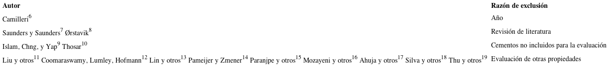 Se excluyeron estudios que evaluaron otras propiedades diferentes a las antimicrobianas de los SE, y acerca de otros cementos. Asimismo, se excluyeron revisiones de la literatura.