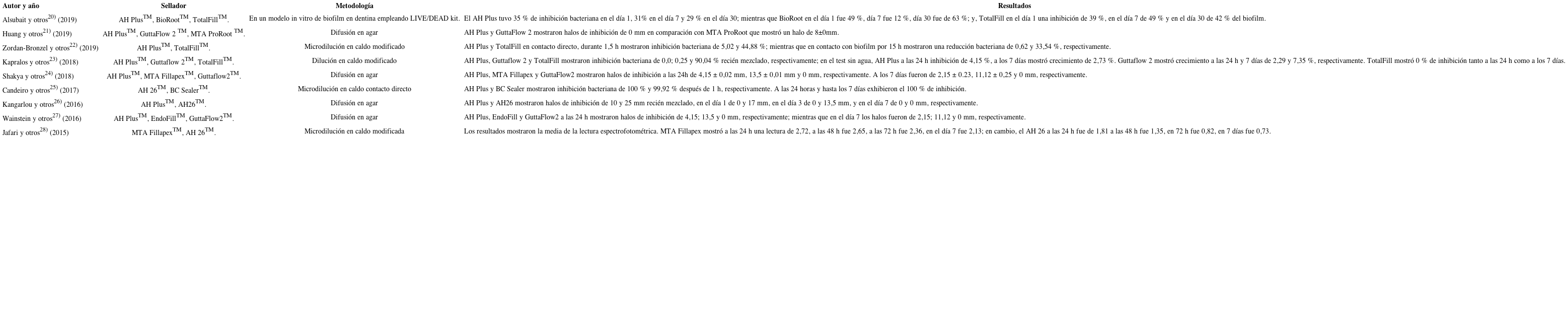 Se incluyeron estudios originales in vitro, cuyo objetivo principal era evaluar los efectos antimicrobianos de al menos uno de los SE, (AH Plus, AH 26, TotalFill, BC Sealer y MTA Fillapex), artículos en idioma inglés y español. Solo se consideraron los que habían sido publicados entre 2010-2019.