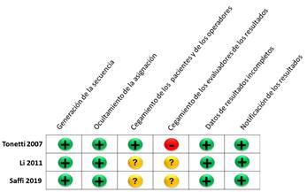 Se realizó el riesgo de sesgo de los ECAs incluidos siguiendo el manual de Cochrane para intervenciones de revisiones sistemáticas versión 5.1.0.12 Se evaluaron seis criterios principales de calidad: generación de la secuencia, ocultamiento de la información, cegamiento de los participantes y del personal, cegamiento de los evaluadores de los resultados, datos de resultados incompletos, reporte selectivo y otros sesgos. Estos criterios se calificaron como bajo (verde), no claro (amarillo) y alto riesgo de sesgo (rojo), según la descripción dada para cada campo individual (Fig. 1).