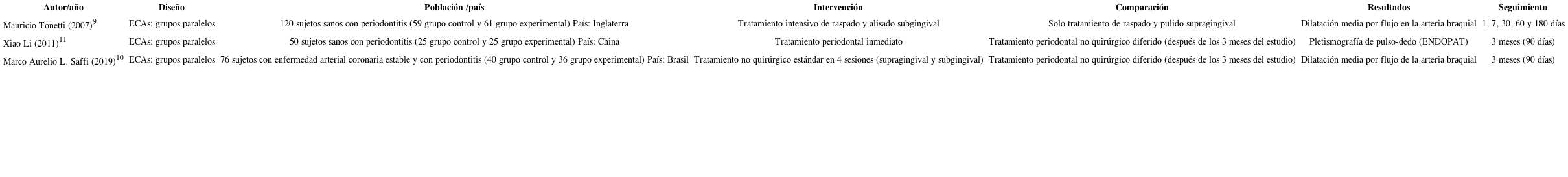 En los ensayos clínicos aleatorizados y controlados que formaron parte de la presente revisión, aparecen un grupo experimental (tratamiento periodontal no quirúrgico convencional o en una sola sesión) en comparación con un grupo de control (tratamiento periodontal solo supragingival o tratamiento periodontal retrasado).9,10,11 Sobre la base de los datos obtenidos (Tabla 1 y 2) la terapia periodontal no presenta un efecto sobre la función endotelial en un periodo de 3 meses. Sin embargo, según el estudio de Tonetti y otros9, a los 6 meses después de la terapia periodontal, se asocia con una mejoría en la dilatación media por flujo en la arteria braquial, que es un método para evaluar la función endotelial.