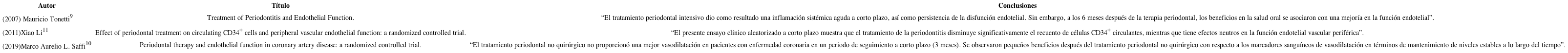 Objetivo: Evaluar los efectos del tratamiento periodontal no quirúrgico sobre la función endotelial de los pacientes con periodontitis crónica mediante una revisión de ensayos clínicos aleatorizados.