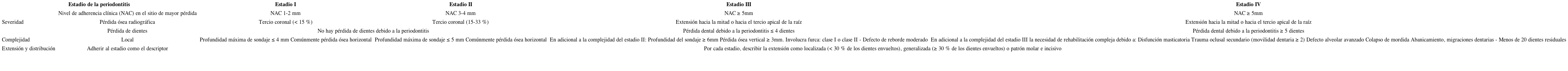 Las cuatro categorías de la estadificación para la periodontitis están determinadas por un número de variables fisiopatológicas (pérdida de inserción clínica, cantidad y el porcentaje de pérdida ósea, la profundidad de sondaje, presencia y la extensión de los defectos óseos angulares y afección de defectos intraradiculares en molares, movilidad dental y pérdida dentaria por periodontitis). Las categorías van desde la etapa I (menos grave), hasta la etapa IV (la más grave progresión, grado C). El nuevo sistema de clasificación permite al profesional desarrollar una estrategia completa de tratamiento en función de las necesidades específicas para cada paciente.13) La descripción de la clasificación de la periodontitis según las etapas de gravedad (según el nivel de pérdida de inserción clínica interdental, pérdida ósea radiográfica y pérdida de dientes), complejidad, extensión y distribución se describen en la tabla 3.