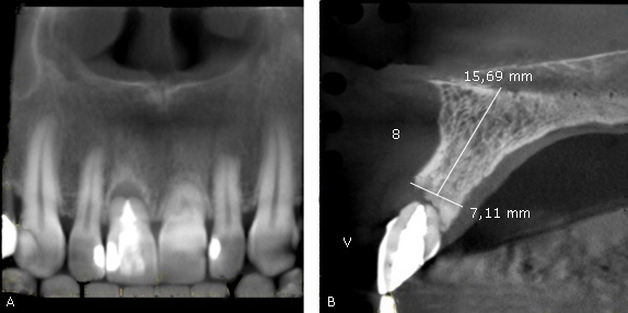 The patient was a 29-year-old female, without systemic disease, completely dentate, with a thick-scalloped gingival biotype.3 The radiographic exam showed the presence of advanced buccal bone resorption secondary to a root infection of the maxillary right central incisor (Tooth 1.1) (Fig. 1- A) and a large osteolytic area on the buccal aspect of the root (Fig. 1-B). The patient’s main complaint was aesthetic.