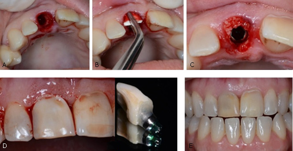 Presentación del caso: Una paciente de 29 años de edad, sin enfermedad sistémica, completamente dentada, con un biotipo gingival festoneado grueso, asiste a la clínica y su principal motivo de consulta fue no estar conforme estéticamente en su incisivo central superior derecho. El examen radiográfico mostró la presencia de una pérdida ósea bucal avanzada, secundaria a una infección de la raíz del incisivo central superior derecho. En una primera fase quirúrgica, se extrajo el incisivo central derecho utilizando una técnica atraumática usando periótomos y se colocó un implante dental. Se adaptó una membrana reabsorbible al defecto vestibular y después se compactó el aloinjerto de hueso cortical particulado en el sitio para llenar el espacio entre la membrana de colágeno y el implante dental. Se realizó una restauración provisional atornillada utilizando el diente natural extraído. El perfil de emergencia se estableció simplemente agregando resina compuesta fluida, hasta que se lograron los contornos deseados. El seguimiento radiológico y clínico a los 6 meses mostró una evolución favorable del implante. No se observaron complicaciones mecánicas ni biológicas durante este periodo de observación. El margen gingival bucal estaba en una posición correcta.