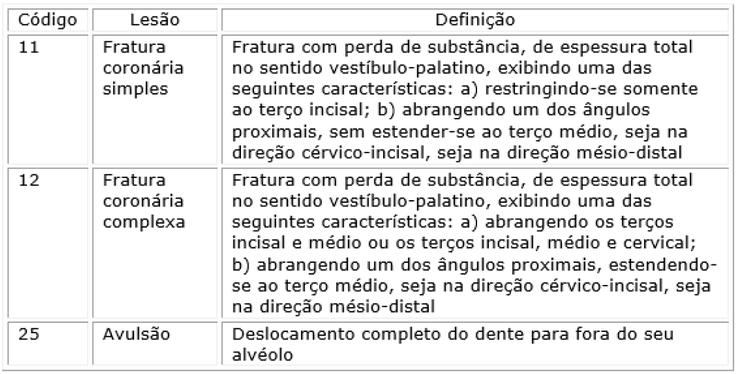 Os tipos de lesão consideradas no presente trabalho restringiram-se a fratura coronária simples, fratura coronária complexa e avulsão dental, por serem as lesões mais frequentemente constatadas na rotina pericial penal. Somente foram incluídas neste estudo, as lesões cujas descrições nos laudos periciais permitiram classificá-las em um destes três tipos de lesão, de acordo com o já explicitado na metodologia. Ou seja, na dúvida, a exclusão.
